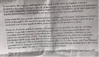 The July 19 letter sent by Catholic Charities Disabilities Services