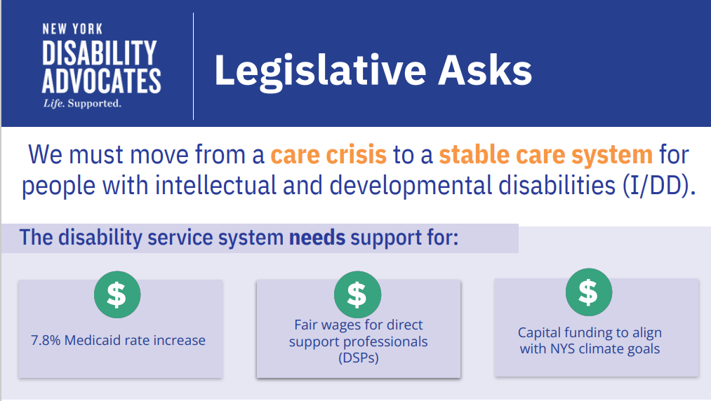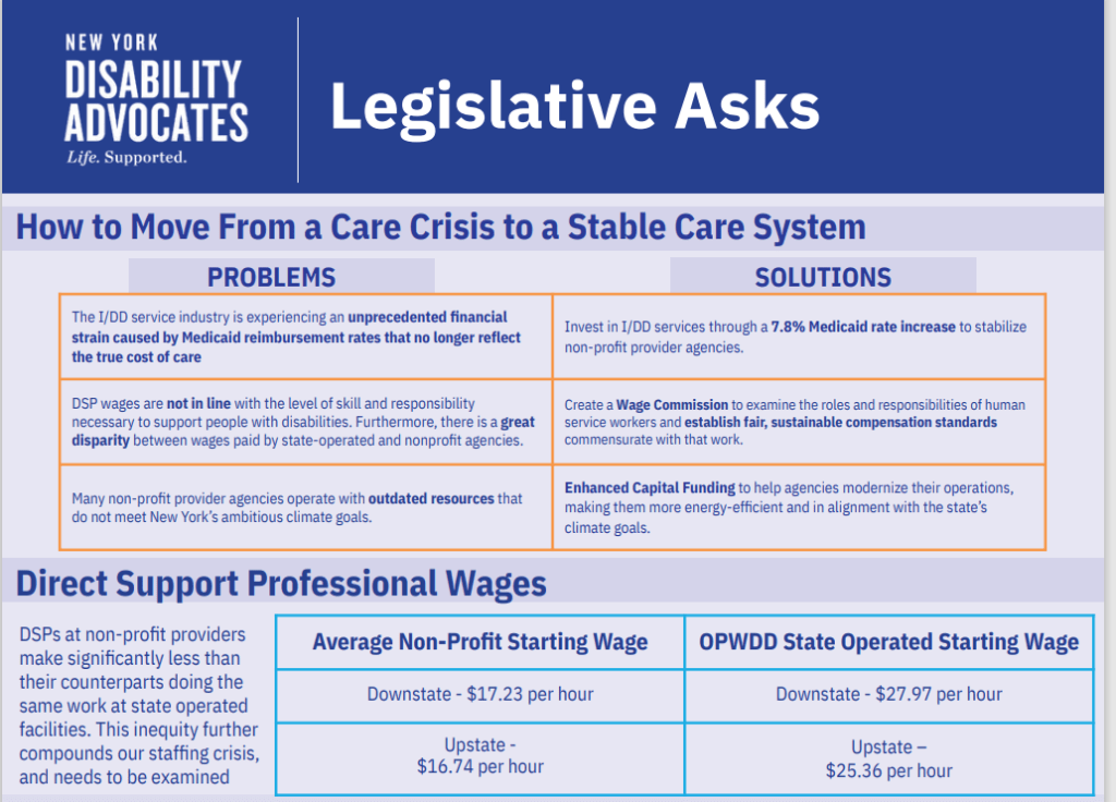 We are calling on her to include the following requests in the 2025-26 New York State Budget:Investment in I/DD services through a 7.8% Medicaid rate increase to stabilize non-profit provider agencies.Creation of a Wage Commission to examine the roles and responsibilities of human service workers and establish fair, sustainable compensation standards commensurate with that work.Enhanced Capital Funding to help agencies modernize their operations, making them more energy-efficient and in alignment with the state’s climate goals.